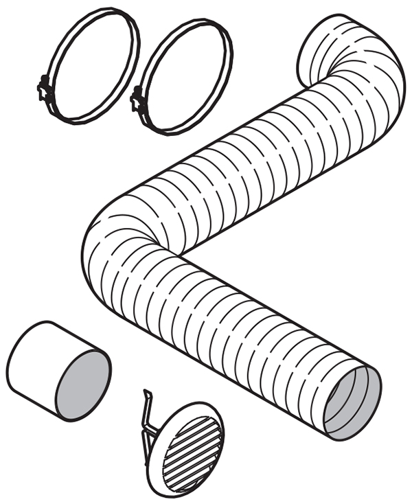 * Kit de distribution d’air : 3 m tuyau flexible aluminium ø8 cm, 1 sortie d’air chaud ø8 cm, 1 sortie d’air chaud orientable, 2 colliers de serrage – Réf. C07002 raccordement dessous – Réf. C07003 raccordement arrière