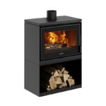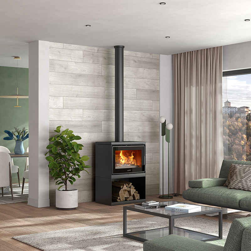 Le poêle à bois Sarra sur bûcher conjugue esthétique et praticité. Son espace de rangement intégré sous le foyer permet de stocker vos bûches à portée de main. A la fois fonctionnel et raffiné, ce modèle offre une vision splendide des flammes grâce à sa vitre grand angle.